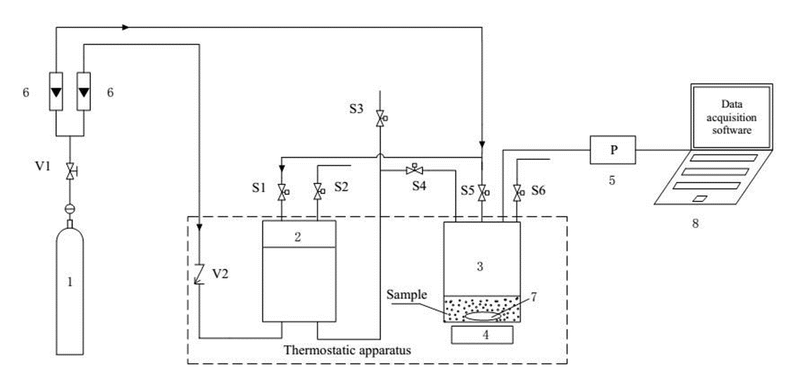 本课题组根据吸液驱气法原理构建了恒容吸液驱气测量方法和实验装置。第1代和第2代恒容吸液驱气装置分别如图2和图3所示。与第1代装置相比,第2代装置增加了吸附剂原位处理系统和低温检测控制系统,并采用触摸屏操作控制模式。